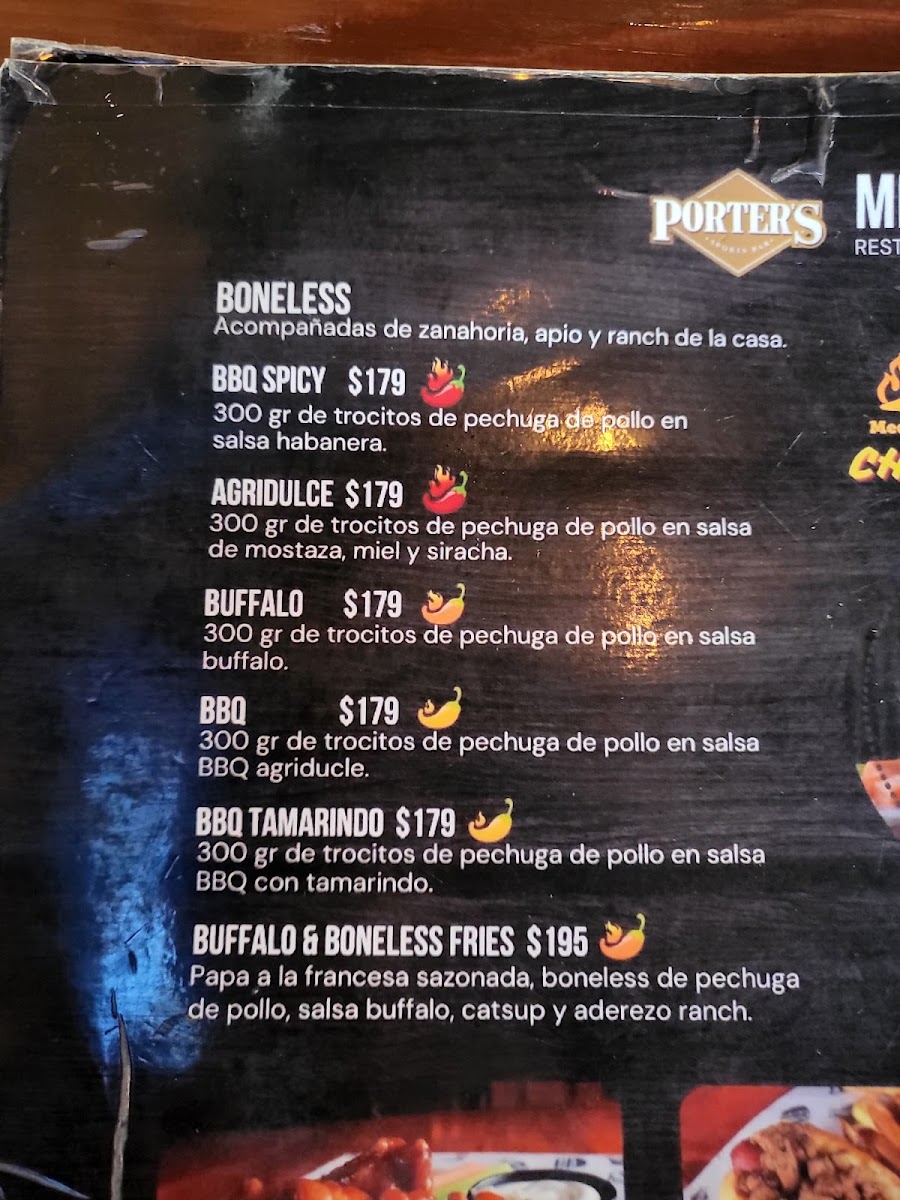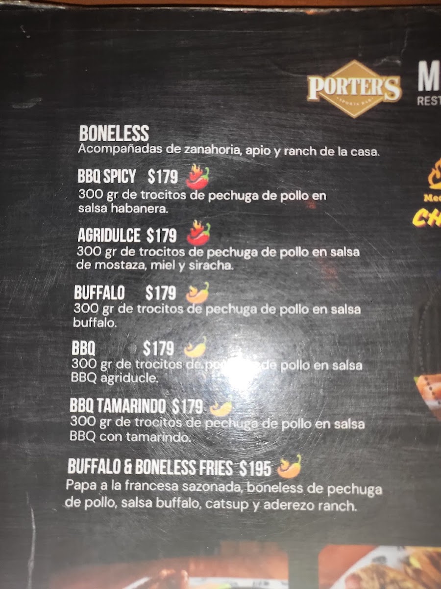 If you're in the mood for something crispy, the Boneless selections are a must-try; choose from tangy BBQ to spicy habanero, served with crunchy veggies for MX$250.00. And don’t miss the Quesadillas that deliver a cheesy, savory punch, with options like arrachera or chicken at MX$200.00 to MX$300.00.